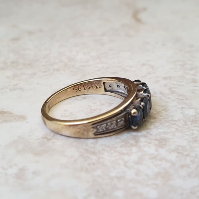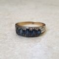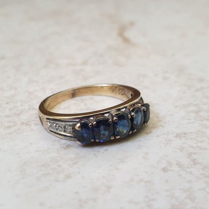 This pretty ring is an ideal stacking band if you like to layer up your sparkly wardrobe. Here are five deep blue oval sapphires set with diamond accents to the shoulders. Not a hugely blingy piece, but certainly striking in its own way, it looks fantastic on the hand, especially when the light catches those sapphires. The overall setting is 5mm at the widest point.