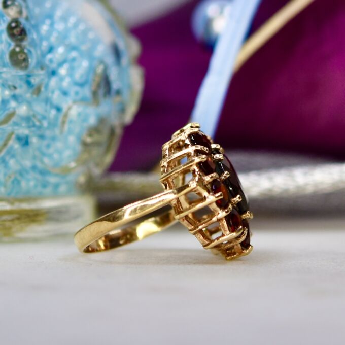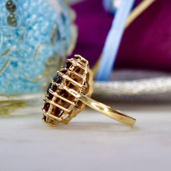 This substantial garnet cluster is a lot of finger coverage! The central oval stone is 10mm by 8mm with 10 smaller stones encircling it, forming an overall setting of 18mm. The shank bears a maker or sponsors mark of RJ alongside a full hallmark for 9ct gold, having been assayed in London in 1975.