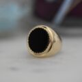 This big bold look is fantastic on the hand. Covering a vast amount of finger estate, the stone is 13mm by 11mm with the overall setting 18mm. The wide shoulders taper to under 4mm at the rear to aid comfort when in use. There is a maker or sponsors mark of AJ Ltd alongside a full hallmark for 9ct gold, having been assayed in London in 1968.